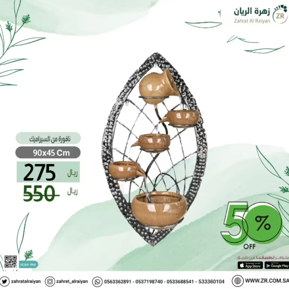 نافورة مميزة، مصنوعة من السيراميك،تتميز بشكلها العصرى،تتساقط منها المياه تدريجيا،تخلق النافورة جواً منعشاً ومشابه لجو الطبيعة،